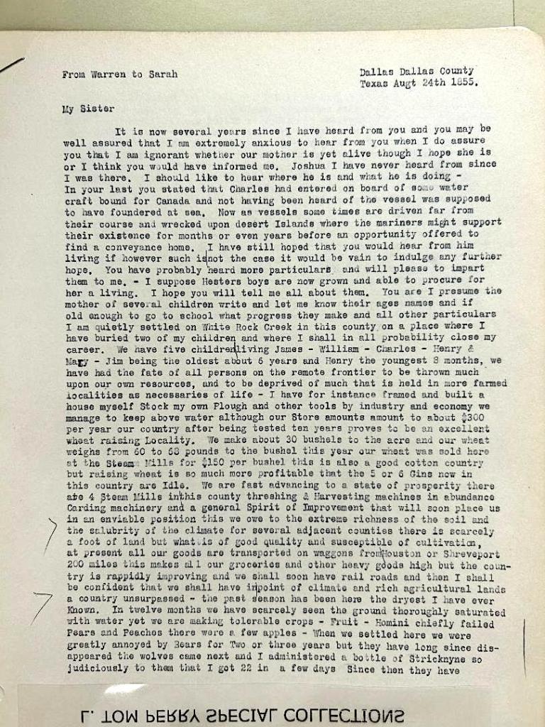 Below: August 24, 1855, Warren writes to his half-sister Sarah. He discusses Charles’ disappearance and life in Texas.