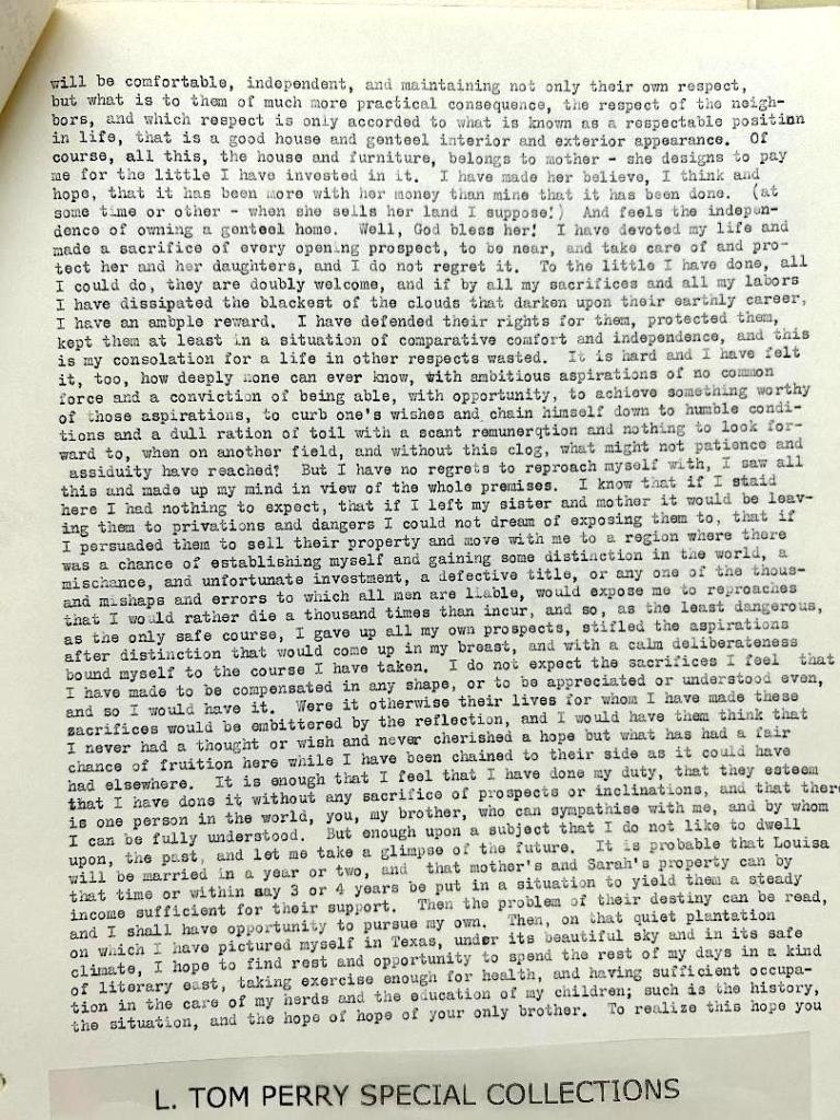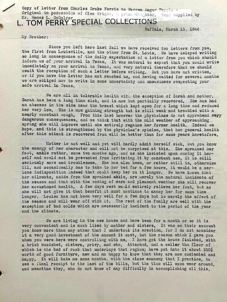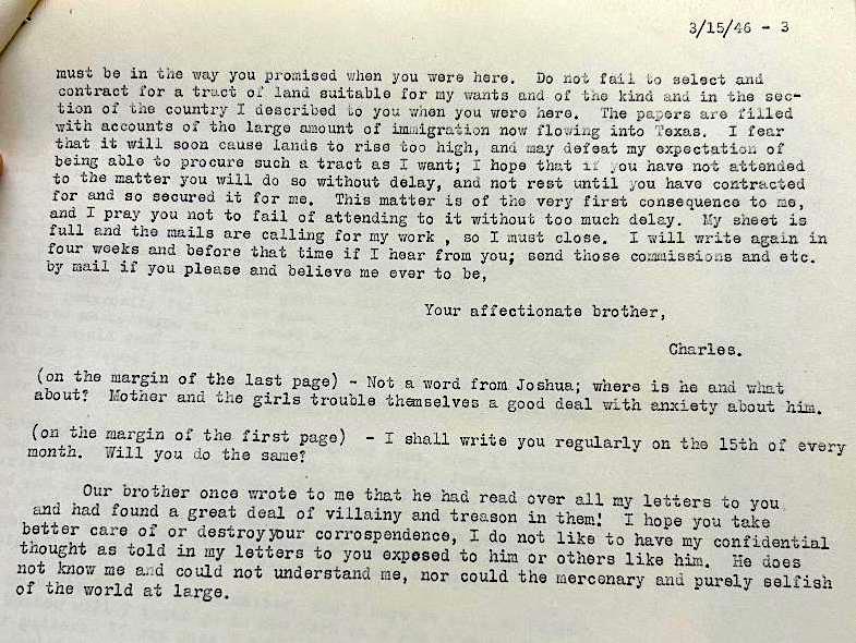 Below: Charles writes to brother Warren with family updates and heartfelt expression of dreams lost due to being “chained” to the care of his mother and half-sisters. In this letter Charles reveals the longing and deep regret he feels from not fulfilling his aspirations and actually speaks of the repercussions that would incur if he were to leave. Also, Charles pleads with Warren to locate and purchase land in Texas before it’s too late. This letter reveals the internal struggle Charles is dealing with resulting from years of stress and could be an indication that he was reaching his limit. Given his disappearance in 1850 and the fact that he discusses leaving in this letter, one has to wonder if he did actually abandon his family in Buffalo.