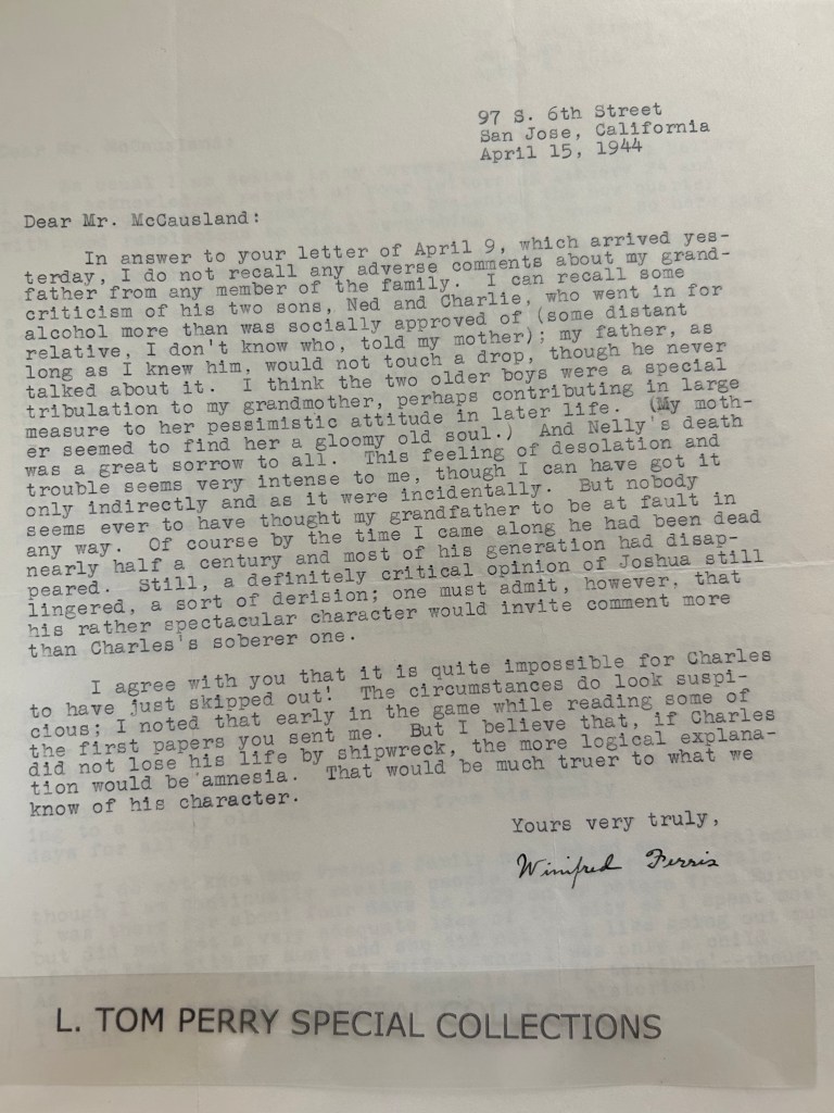 Below: May 15, 1944, Miss Ferris responds to Mr. McClausland on May 15, 1944. She suggests that perhaps Charles suffered from “amnesia” due to his mental state due to being overwhelmed with financial and family responsibilities. She suggests that Charles may have never gotten boarded the Unicorn at all. She refers to the 1846 letter Charles had written to Warren expressing his life regrets and that he was suffering .