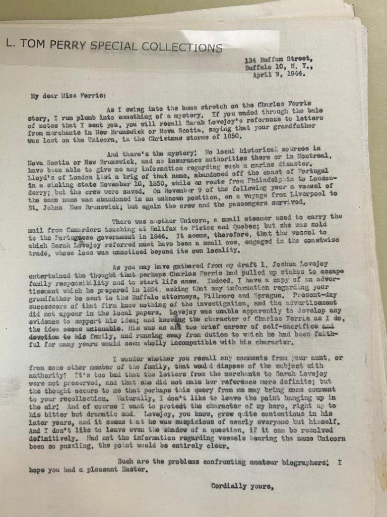 Below: April 9, 1944, Walter McClausland writes to Miss Winifred Ferris (Charles’ granddaughter) explaining that there are no maritime, historical, or insurance records that provide information supporting the story that Charles’ ship, the Unicorn, was lost at sea in the Christmas storms of 1850. He brings up Joshua Lovejoy’s theory that Charles “skipped out”. He mentions an advertisement that Joshua created to place in the newspaper inquiring about Charles’ disapearance. (There is a copy of this in the family paper collections). McClausand asks Ms. Ferris if she recalls any comments made by family about this possibility.