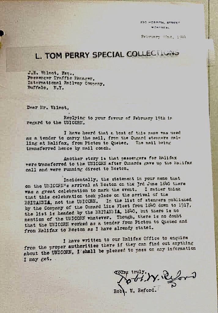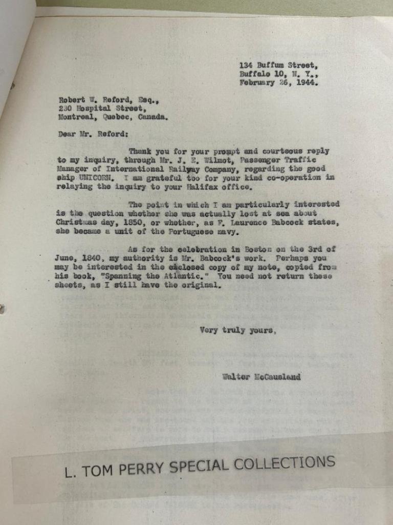 Below: March 18, 1944, Mr. Robert Reford writes to McCausland stating that the Unicorn that was reported to be lost at sea, December, 1850, was likely a vessel using the same name as the two other Unicorn ships that have maritime records.