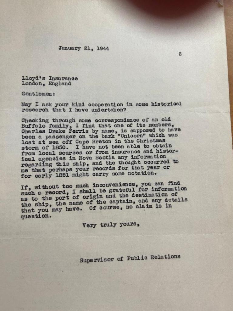 Below: January 21, 1944, Walter McCausland writes to Lloyd’s Insurance in London, England inquiring about records of a barque named “Unicorn” lost at sea December 1850, off Cape Breton, Nova Scotia.