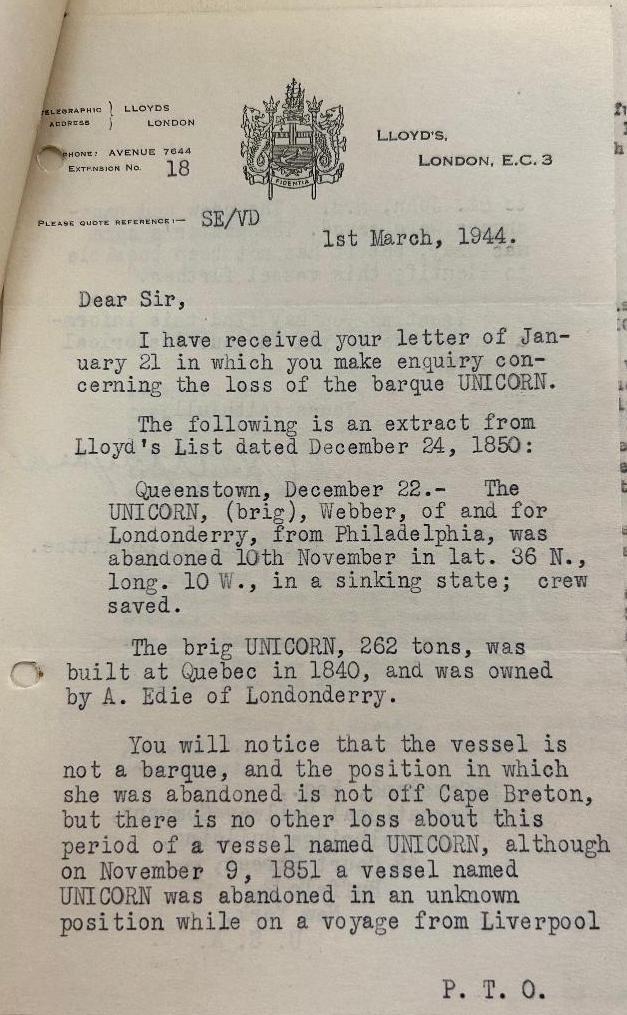 Below: March 14, 1944, McCauland writes to Mr. Appleyard of Lloyd’s London stating that it’s unlikely that the two Unicorn ships with maritime records in 1850 are the same Unicorn that sank in December, 1850.