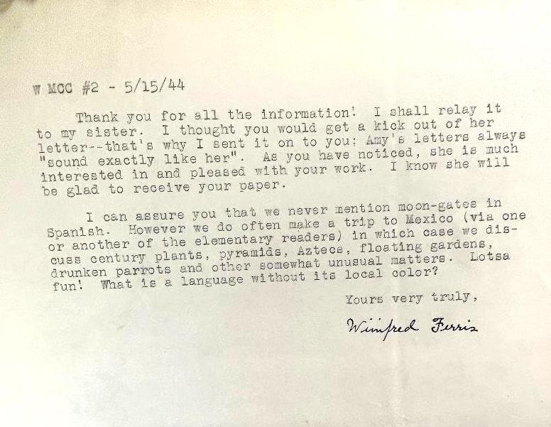 Below: April 30, 1944, Charles’ granddaughter, Amy Ferris, writes to her sister, Winifred. She states that as a child, there was very little spoken about Charles. She speaks to possible resentment felt by the family for Charles not being present and out “adventuring”.