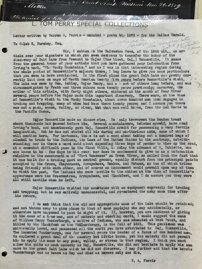 In 1836, Warren Angus Ferris created the “Map of the Northwest Fur Country” which documented the current Salt Lake and surrounding area. The map was based on his explorations while working for the American Fur Company from 1830-1835. The original map is currently held at the B.Y.U. L. Tom Perry Special Collections Library in Provo, Utah. Ferris recorded this area 10 years prior to John C. Fremont’s explorations. Unfortunately, credit for discovering the area has been primarily given to Fremont. Apparently, in 1872, there was discussion to change the applied credit from Fremont to Bonneville. Warren Ferris, was outraged by this and, as a writer for the Dallas Herald, wrote a letter to Caleb G. Forshey, Esq. to challenge this considered change. The remarkable element of this letter is how self-effacing Ferris was. He never boasts about his own accomplishments, instead suggesting that an alternative name of William Henry Vandenburgh be considered. (Please refer to the post about Vandenburgh, an excerpt from “Life in the Rocky Mountains”.)